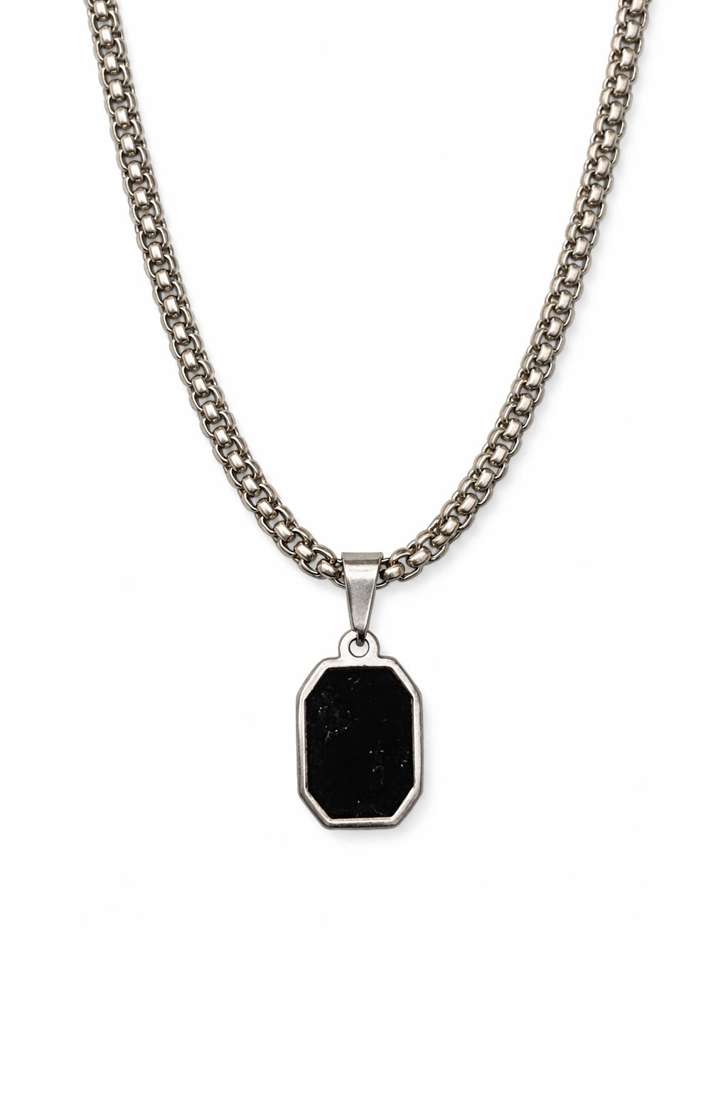Center your style with a statement piece designed for modern impact. This pendant features a deep, obsidian-black stone set within a precision-crafted, eight-sided silver frame. The clean, architectural lines create a sharp silhouette that adds immediate depth to any look.
